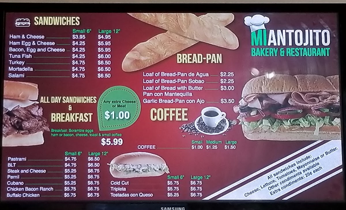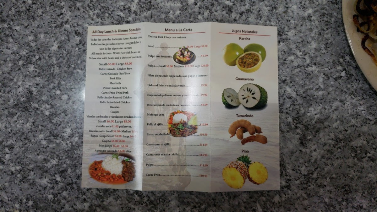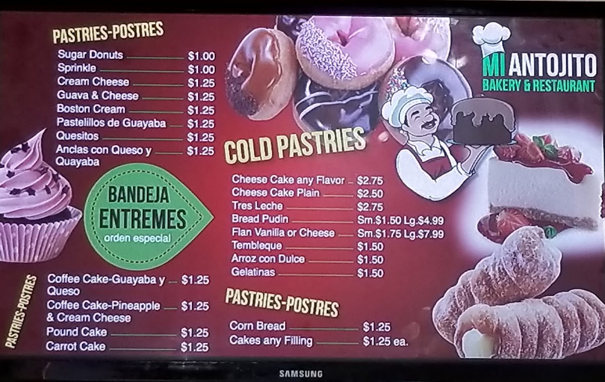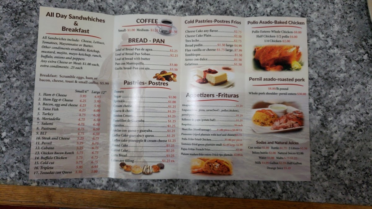 The menu at Mi Antojito Bakery & Restaurant features a blend of traditional Puerto Rican cuisine alongside a variety of baked goods. It is organized into several groups to accommodate different dining preferences throughout the day.